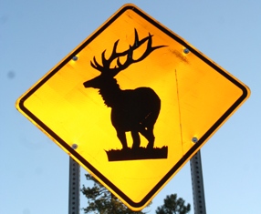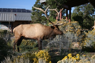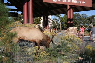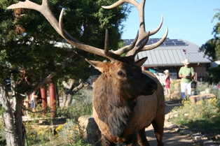 Rencontre spectaculaire au visitor Center (encore un Elk payé par le parc !). Pas farouche, il broute (défonce) tranquilement les petites plantations jusqu'à ce que des rangers viennent lui demander gentiment de bien vouloir quitter les lieux car cela commence à devenir un dangereux pour les touristes un peu trop curieux (comme Bérengère par exemple qui s'est retrouvée à quelques cornes de ce beau male !)