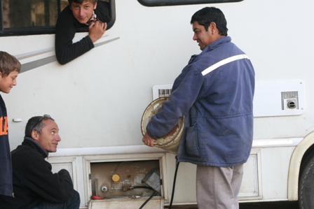 Nous nous rechargeons en gaz avec le raccord que nous avons avons fait faire à Salta et ... ça marche ! Il suffit de dévisser la sortie gaz de notre reservoir au niveau du détendeur et de visser notre adaptateur. A l'autre bout, nous fixons une bouteille classique de propane que nous vidons par gravité !