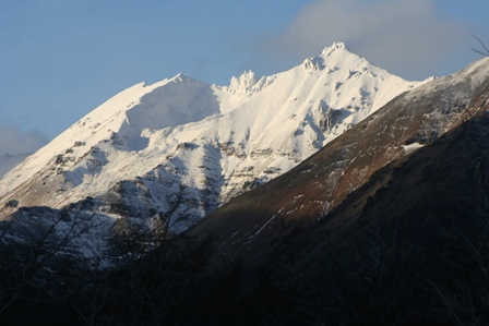 Nous approchons de la petite ville El Chalten et nous avons la chance d'apercevoir au loin les pics du Fitz Roy (3441m) et du Cerro Torre (3138m).