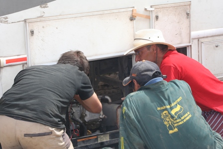 .. pendant qu'olivier aidé par leurs mécanos va démonter le générateur de la "boite" qui ne veut plus faire du 110v (du moins avant que l'on s'aperçoive qu'il suffissait de mettre la fiche électrique dans la prise prévue à cet effet !)