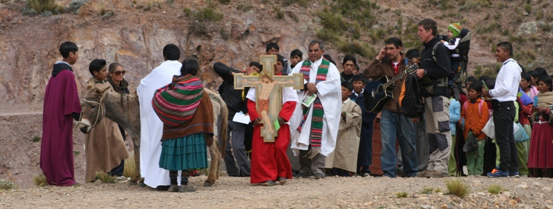 Nous sommes le dimanche des Rameaux et nous les suivons pour une procession et une journée de catéchisme."