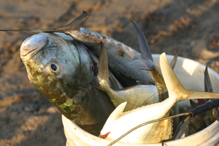 Nous sommes à une époque où les conditions sont exceptionnelles : il a beaucoup plu ce qui amène au bord des plages de nombreux aliments pour les sardines (!) et les petits poissons, ce qui attire ainsi de plus gros poissons et ce qui rend la pêche miraculeuse !