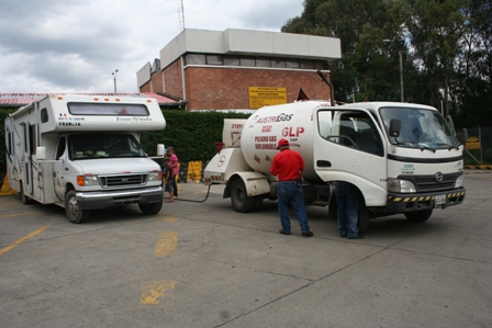 Depuis la Colombie, il est maintenant difficile compte tenu de notre raccord US de nous recharger en gaz propane. Mais heureusement, nous avons les coordonnées GPS, grâce aux forum de voyageurs au long cours, d'une usine à l'entrée de Cuenca. C'est directement le camion qui vient nous remplir notre reservoir.Nous sommes tranquilles pour 3 semaines, le problème se reposera pour tous les autres pays d'Amerique Latine. Il faudrait que nous fassions fabriquer un adaptateur qui nous permettrait de vider les bouteilles de gaz classique dans notre tank.