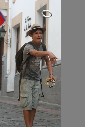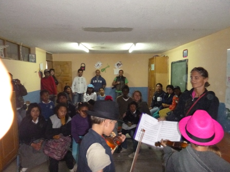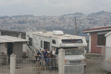 Nous parquons la "boite" dans la cours de l'eglise de la Roldos (quartier nord de Quito), les enfants font un concert aux enfants et nous passons une très bonne soirée avec le groupe de Français d'Ecuasol. Merci Eric ! (et vive le saucisson !).