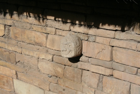 Des têtes de pierres effrayantes représentants des divinités sont réparties tout le long de l'enceinte d'entrée accueillaient les visiteurs.