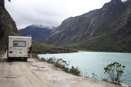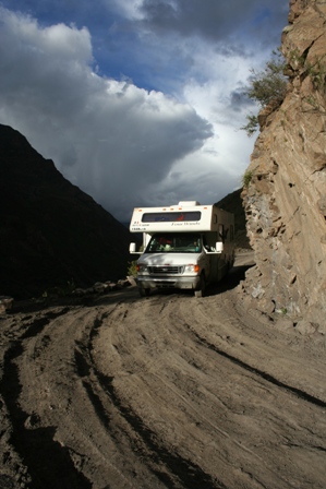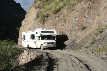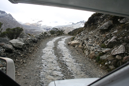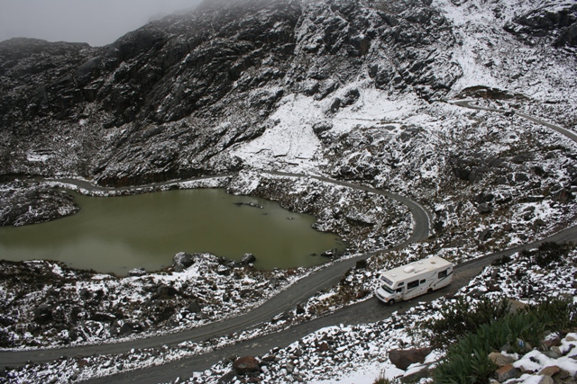 ... qui nous oblige souvent à passer les virages en plusieurs fois. La boite racle un peu, nous devons enlever quelques cailloux, mais finalement, nous franchissons sans encombre le col enneigé perché à plus de 4700m.