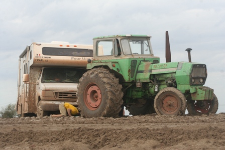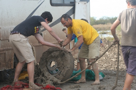 ça a faillit marcher (enfin rouler) mais la corde a fini par s'enrouler entre les roues jumelées et alors que nous sommes en pente et dans la gadoue, nous faisons la bétise de demonter une roue pour la décoincer.