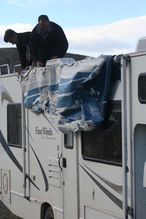 Les cailloux volent sur le pare-brise, la "boite" bouge dans tous les sens jusqu'à ce que nous entendions un horrible bruit qui vient frapper le côté du cc : l'auvent vient de se dechirer ! Nous devons vite le sectionner avant qu'il nous casse une vitre ! C'est l'enfer ! Même les tarentules que nous croisons ont de la peine à rester sur leurs pattes.
