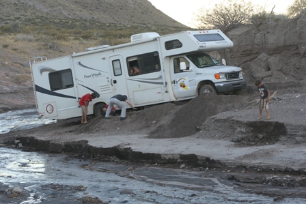 La piste est coupée ! Nous devons traverser un gué et evidemment c'est l'ensablement !