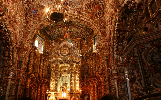 Tonantzintla et Acatepec : 2 petits villages aux églises délirantes. Angelots, saints, archanges, évêques rois et autres glorieux personnages peuplent par centaines les murs et les voutes tapissées de motifs floraux en stuc et arabesques dorées. De l'ultra baroque populaire !