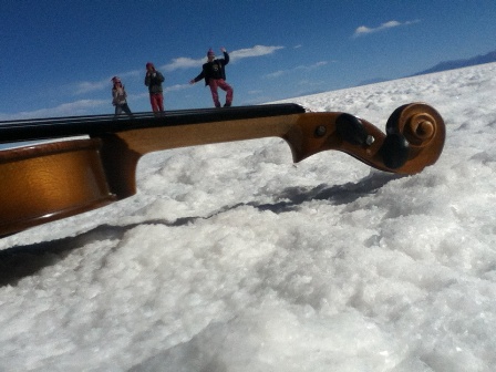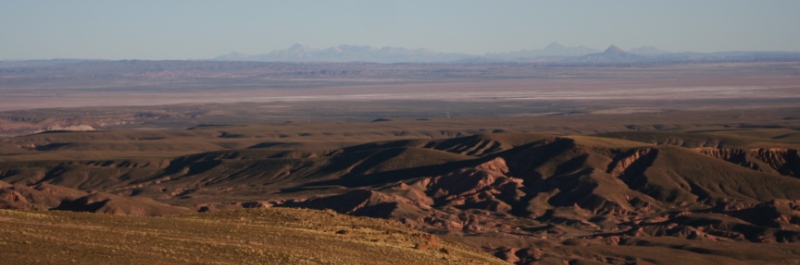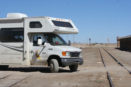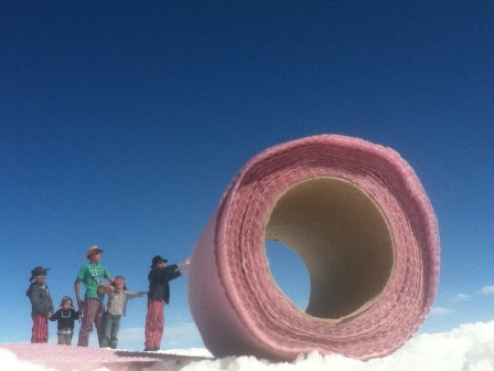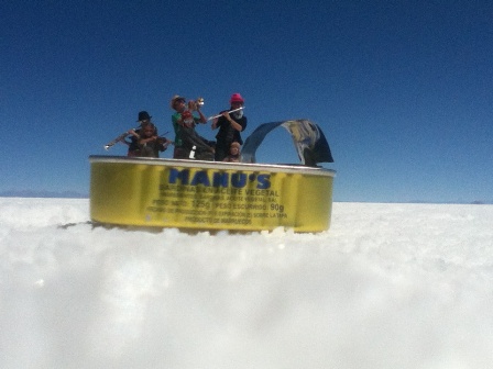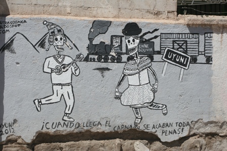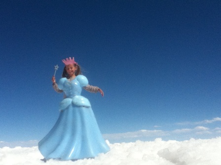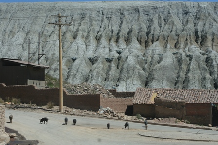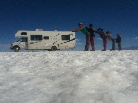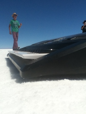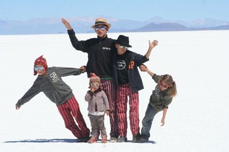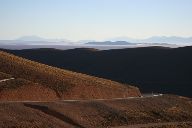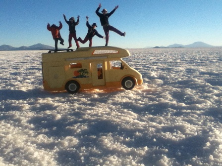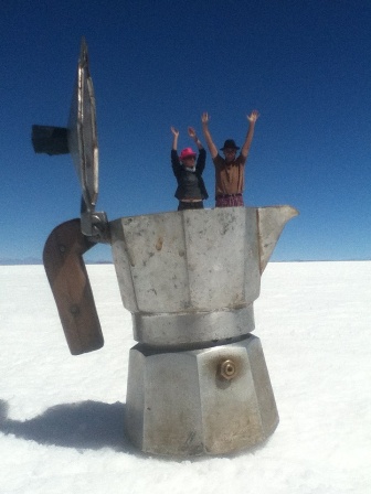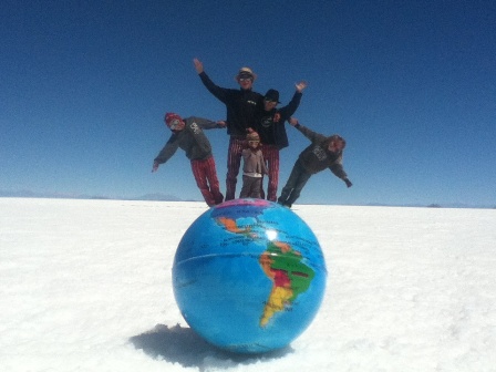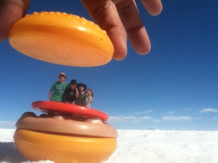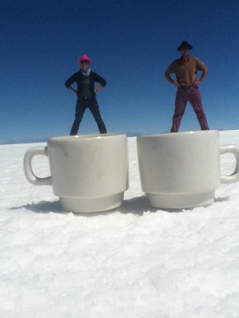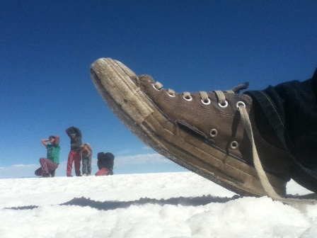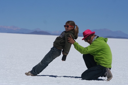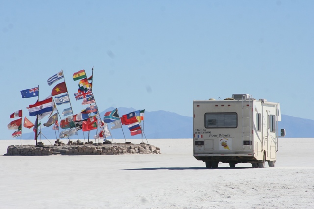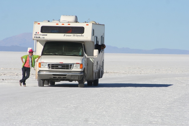 Après une nuit à UYUNI, une ville étrange avec ses rues plates et rectilignes sans végétation, ses statues staliniennes, ses locomotives rouillées et sa caserne grise, sa poussière permanente, sa station essence souvent en rupture, nous prenons la piste qui conduit au plus grand desert de sel du monde : le Salar !