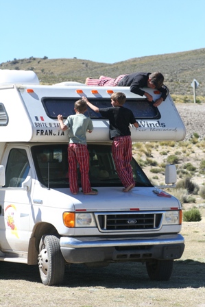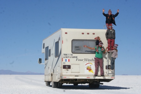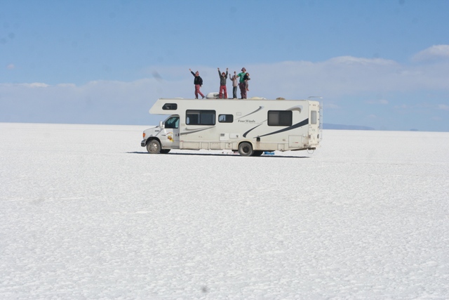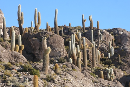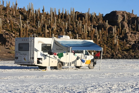 Après 2 heures de désert blanc, nous atteignons l'Isla del Pescado, un ilot de cactus proche duquel nous "plantons" notre camps. Nuit très fraiche !