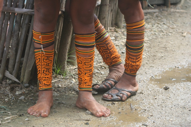 Un anneau d'or dans le nez, des cheveux noirs coupés courts, 2 molas cousus sur la blouse, une jupe portefeuille aux motifs colorés, des bracelets de perles aux poignets et sur les mollets, voici la tenue traditionnelle de la femme Kuna.