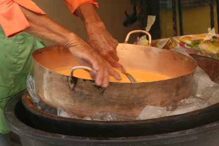 Une des spécialités, c'est la "helado de paila", la glace maison. La recette est simple : prendre un grande bassine en cuivre que vous déposez sur un lit de glace, verser le fruit de la passion mixé en jus. D'une main vous tournez sans discontinuer le recipient en cuivre, de l'autre vous raclez avec une cuillere. Au bout d'un moment, vous obtenez un délicieux sorbet.