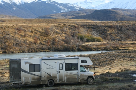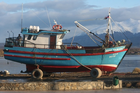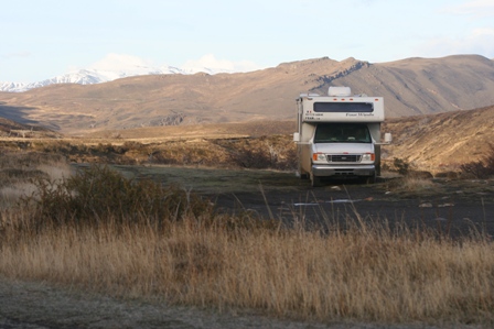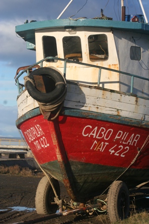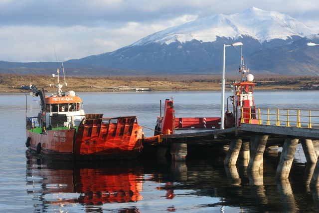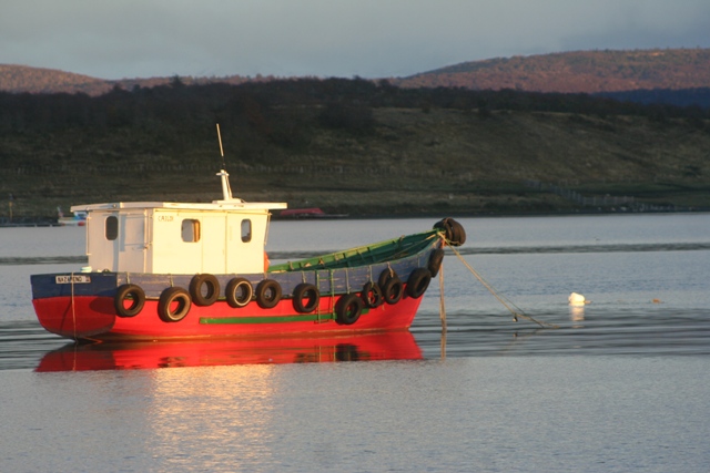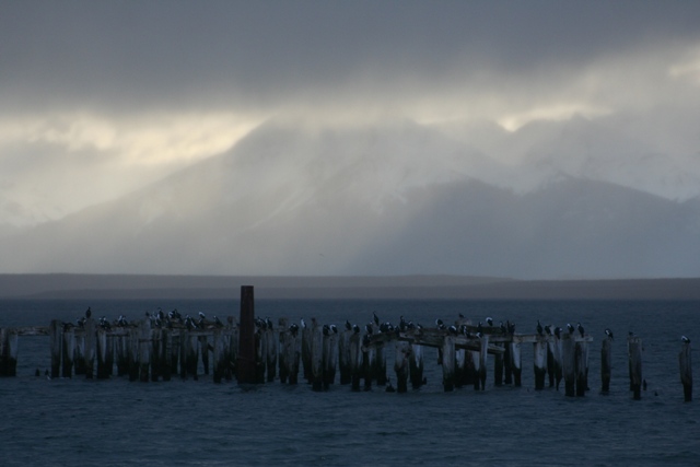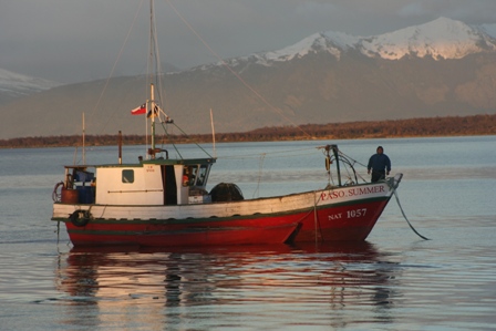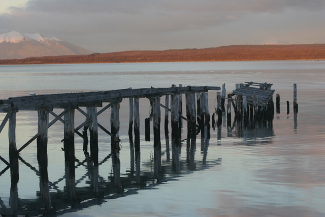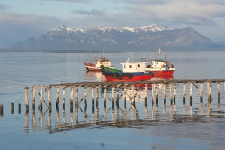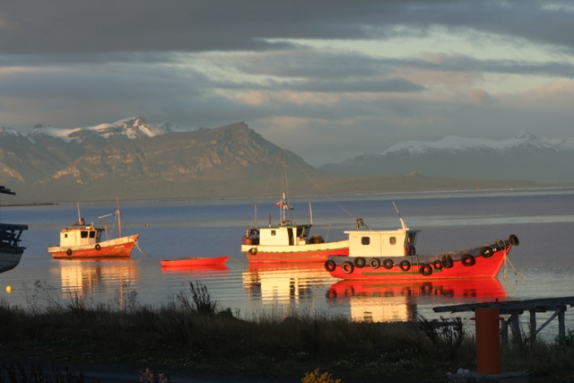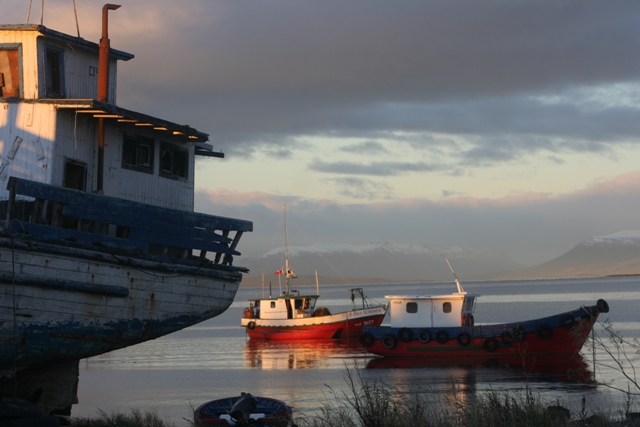 Nous bivouaquons dans la ville Chilienne de Puerto Natales, petit port aux bateaux de bois colorés situé au bord de la mer face aux Andes de Patagonie.